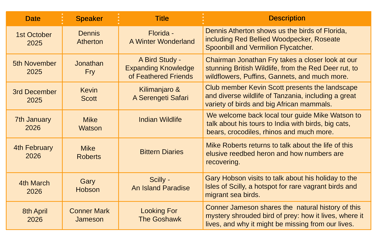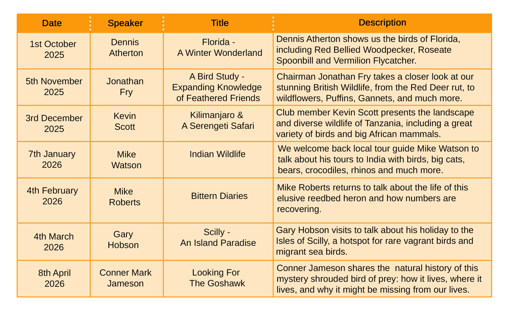 Guest speakers are invited to every meeting, giving outstanding photographic presentations on British birds and birds of the world. Some speakers are actually wildlife guides, while others go on holidays specifically to see birds. All these speakers are experienced and knowledgeable, and their presentations provide great entertainment. To see our current programme of indoor events please see the table further down this page.